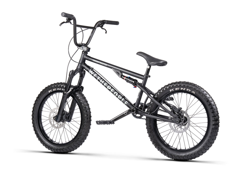 A whole new world of fun, the SWAMP MASTER is the first full suspension complete BMX bike. Inspired by the world of downhill mountain biking, mixed with classic BMX roots and fun, this bike is unique to say the least. Engineered in Cologne, Germany, the SWAMP MASTER is designed for serious downhill shredding whilst gaining the movement and freedom that a BMX bike offers. Spec’d with a mixture of our own aftermarket BMX components and genuine MTB parts from Kenda and Manitou, the SWAMP MASTER is the first production complete bike of its kind and is set to revolutionise a new chapter in BMX and MTB fusion.