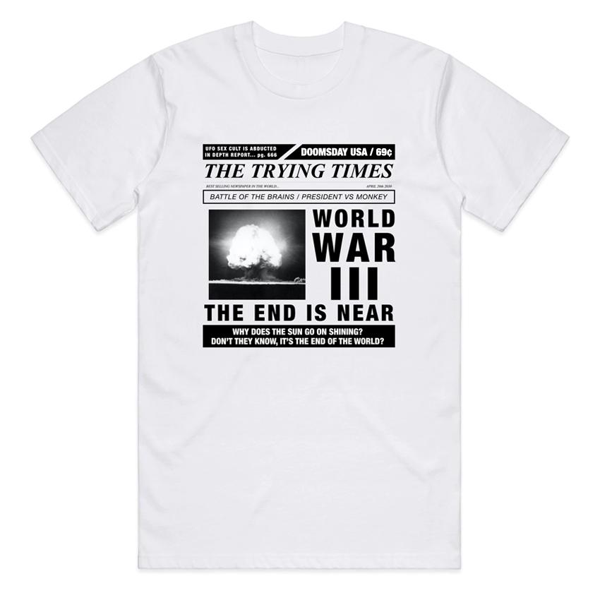 T-shirt Cult World War 3, in morbido cotone. Disegno stile pagina di giornale stampato al centro del petto.