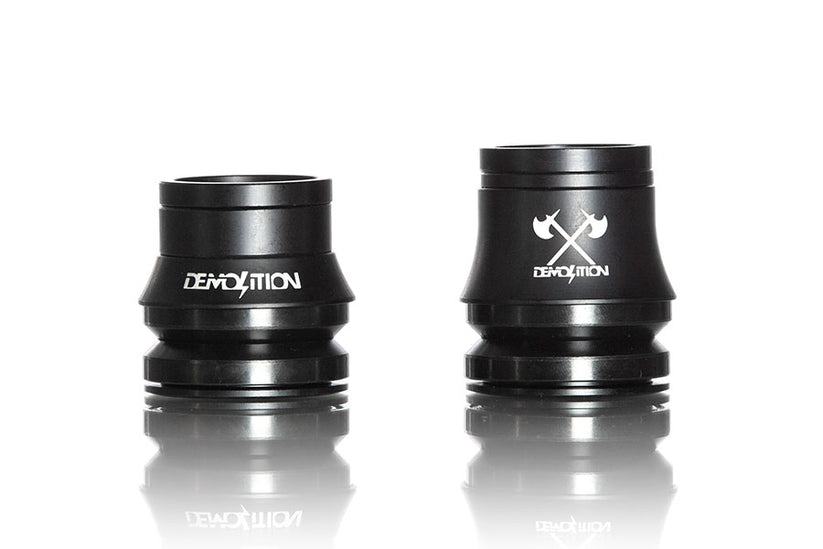 Serie sterzo Demolition V2, con cappuccio parapolvere con logo inciso al laser. Le specifiche dei cuscinetti a cartuccia seguono gli standard Campagnolo, sono dei cuscinetti conici a 45° di misura 1" 1/8. I cappucci parapolvere sono dotati di un O-ring in gomma e presentano dei loghi Demolition incisi.