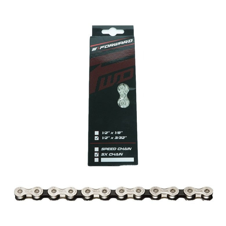 Catena Forward SX con 116 links, adatta per BMX da race con catene da 1/2" x 3/32". Si caratterizza per un perno fustellato e delle piastre esterne smussate, include un connettore rapido.Peso: 338 g