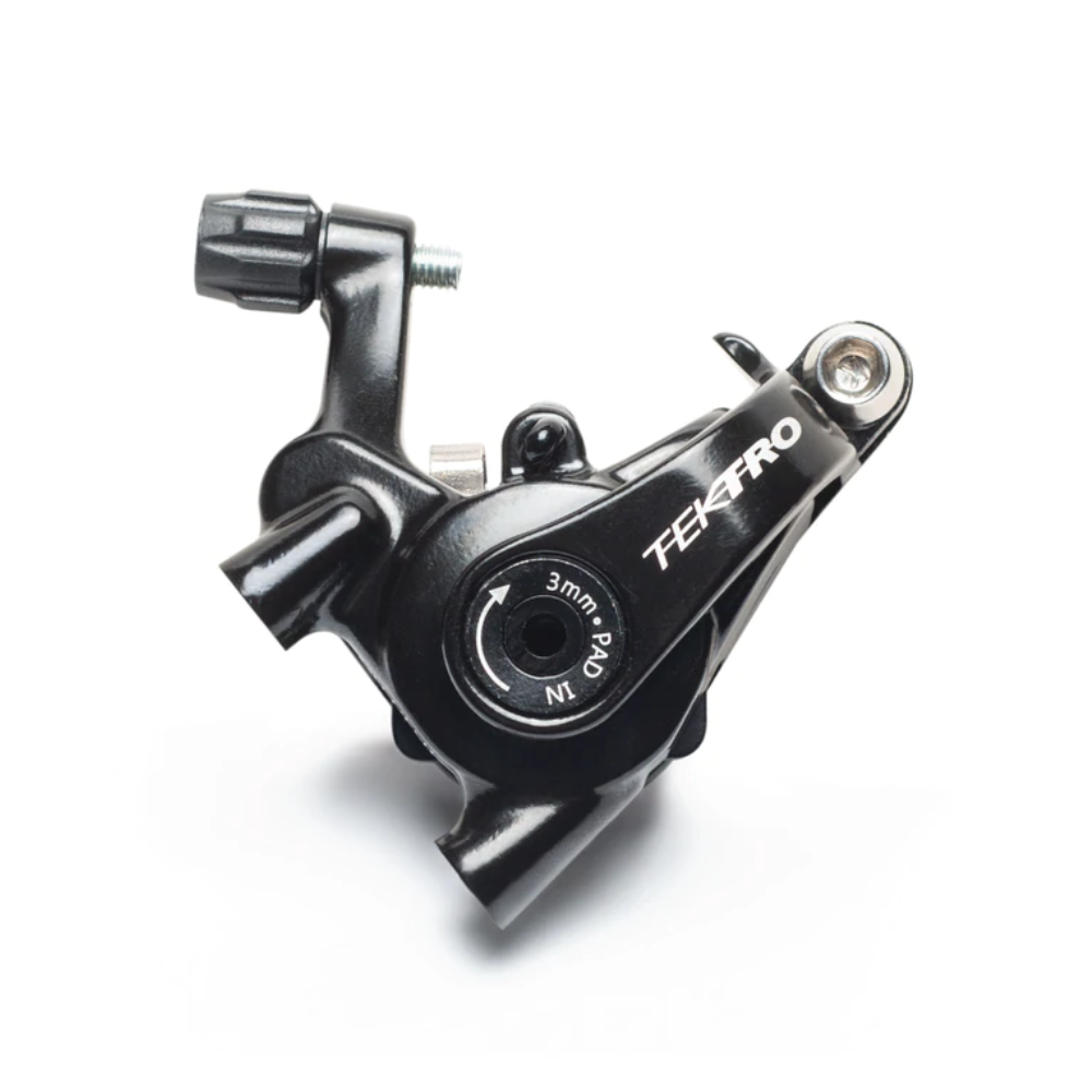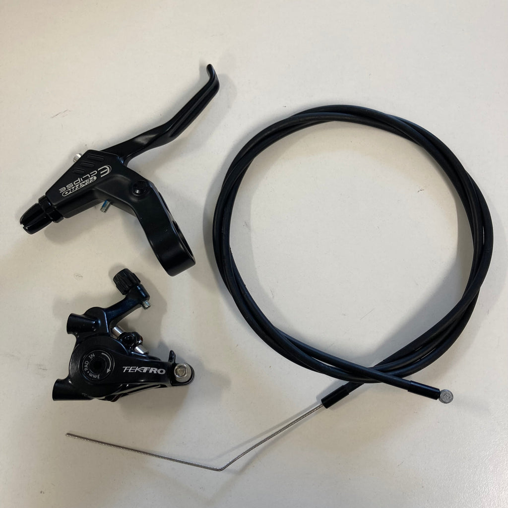 Composto da cavo, leva freno a due dita Tektro Eclipse MT 3.0 (realizzata in alluminio e compatibile con i sistemi meccanici e a disco) e pinza freno a disco meccanica Tektro flat mount MD C-550, realizzata in alluminio e azionata da un cavo a doppio pistone, si caratterizza per una regolazione indipendente dei pad.
