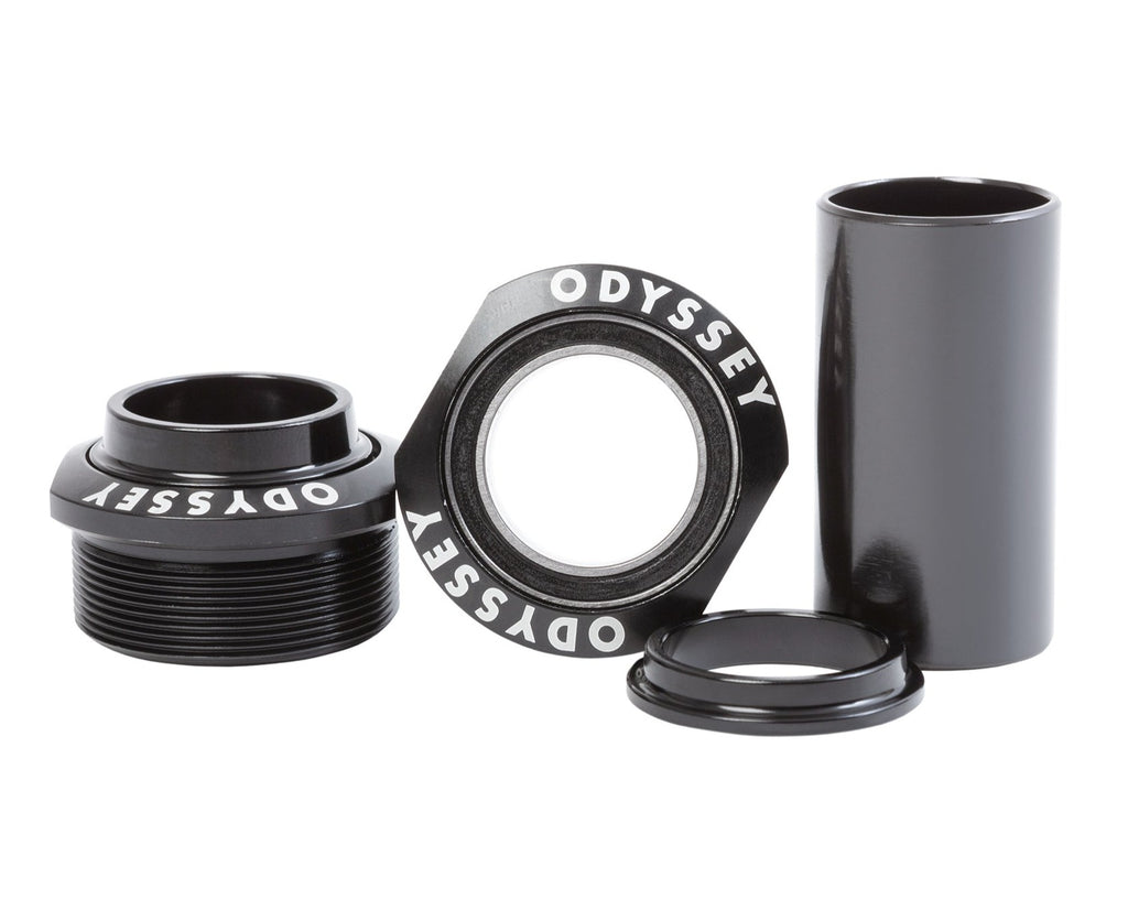 Kit di cuscinetti della pedaliera Euro BB di Odyssey. Composto da quattro cuscinetti sigillati Euro, distanziatore interno e coppia di parapolvere conici curvi con logo Odyssey inciso.