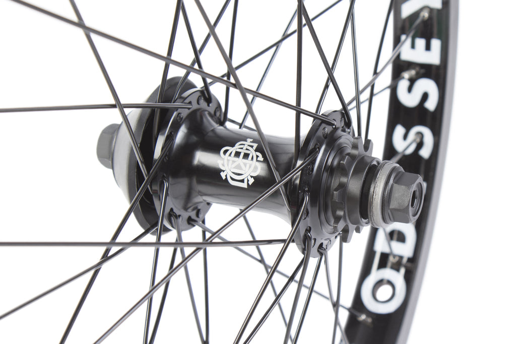 Ruota posteriore completa Odyssey Hazard + Antigram. Questa ruota completa è composta da un mozzo cassette Odyssey Antigram V2 allacciato tramite un set di raggi Odyssey HGS ad un cerchio Odyssey Hazard Lite, una combo davvero perfetta per chi ha bisogno di una ruota molto affidabile, senza nemmeno il bisogno di assemblarla o regolarla!