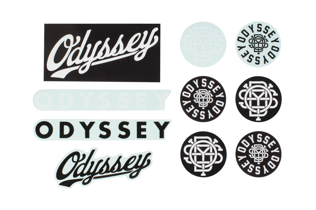 Pacco di 10 adesivi assortiti Odyssey in vinile, bianchi con sfondo nero oppure bianchi o neri con sfondo trasparente.