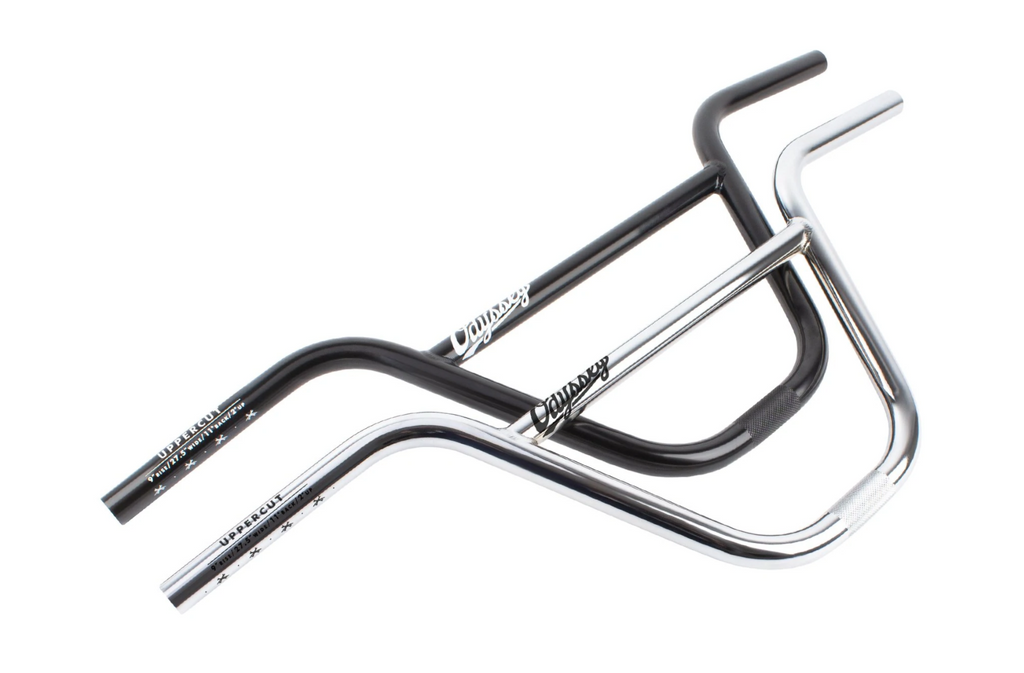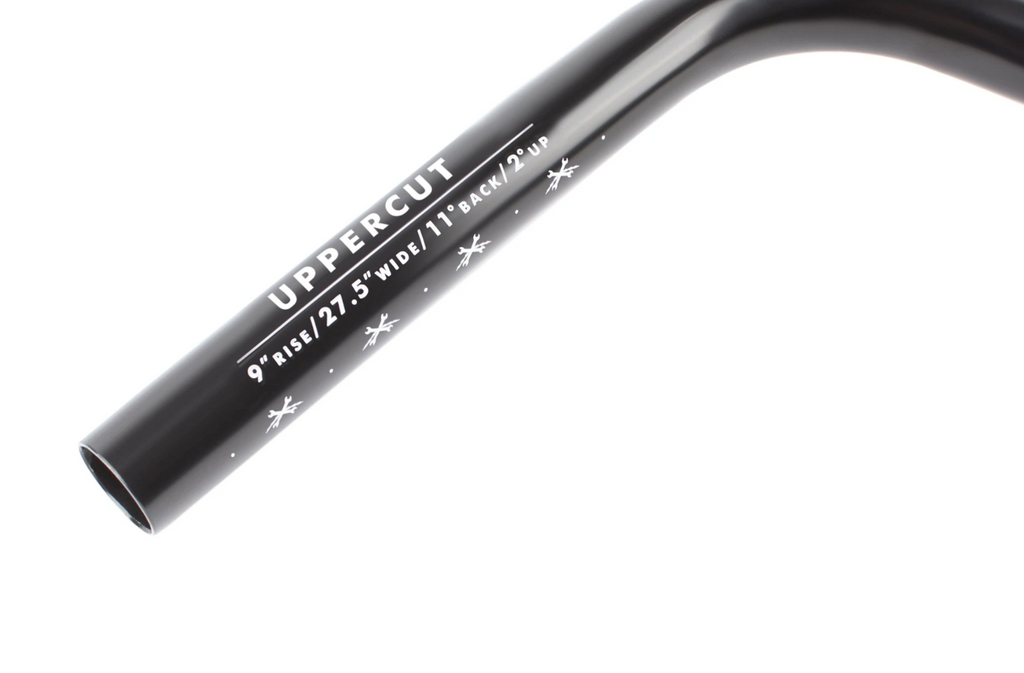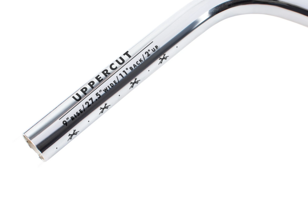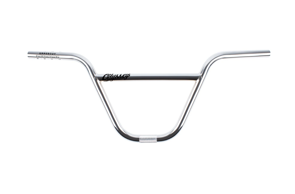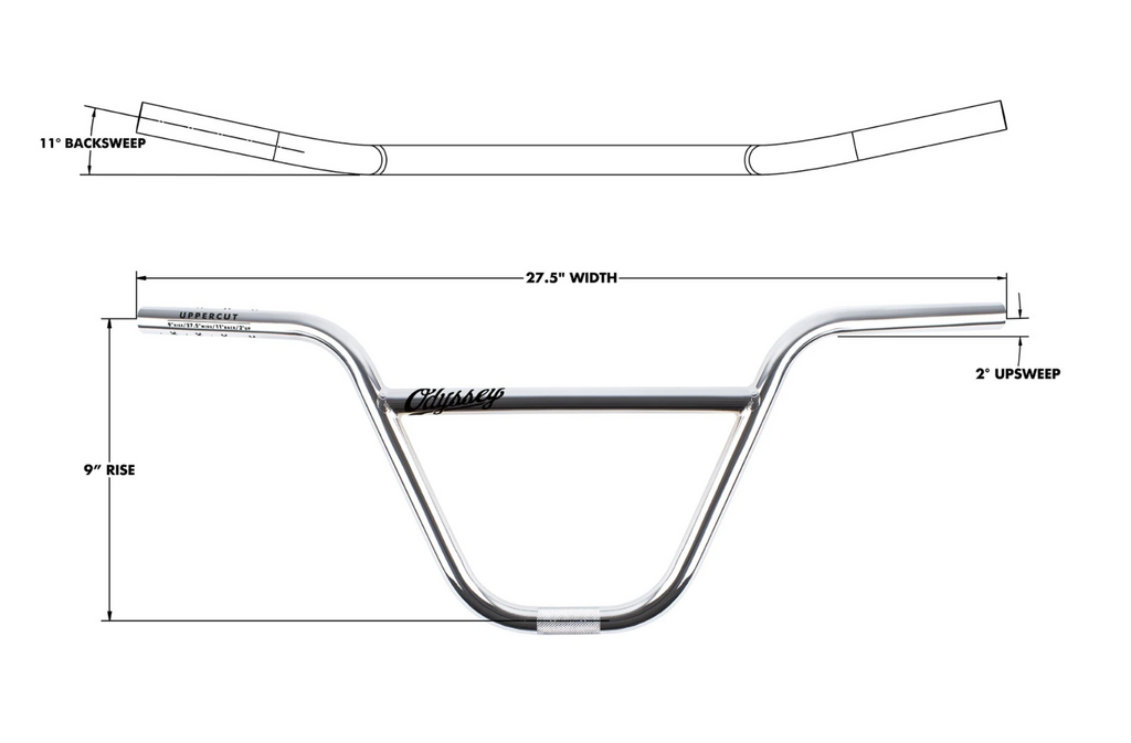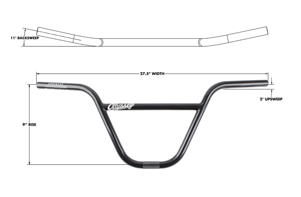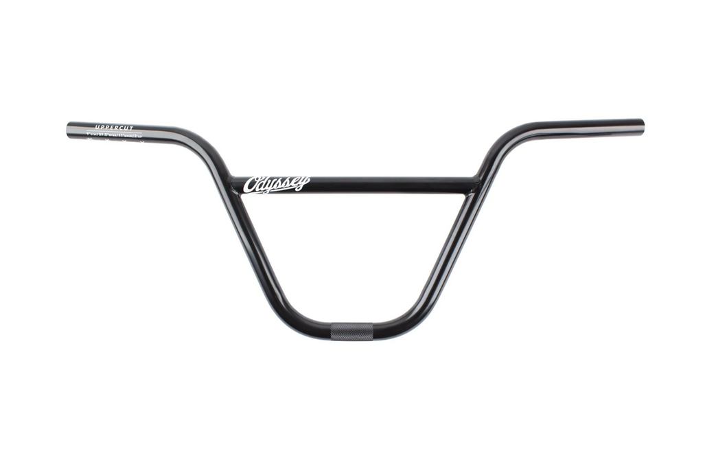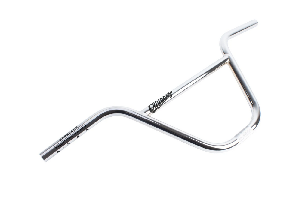 Manubrio Odyssey Uppercut, con altezza 9" e larghezza 27.5", pretagliata rispetto ai manubri odierni, che solitamente sono larghi intorno ai 29" di serie. Questo manubrio è realizzato, come di standard per Odyssey, in Chromoly 4130 con doppio spessore e trattato termicamente post-saldatura, con curve ad ampio raggio per una maggiore resistenza e affidabilità. Il crossbar rinforzato ha un diametro di 20 mm e il tubo principale è multistrato con spessore da 1,8 a 1,3 mm.