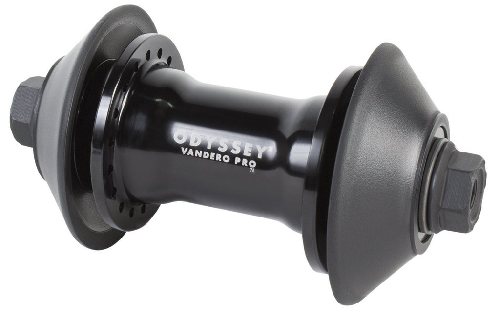 Mozzo anteriore Odyssey Vandero Pro, migliorato dalla sua precedente versione. Questo mozzo anteriore è dotato di una scocca realizzata in alluminio 7075-T6, che alloggia dei cuscinetti a sfera a cartuccia sigillata 6903RS. I bulloni sono da 10 mm in Chromoly con un'asse femmina da 17 mm sempre in Chromoly 4130. Le sedi dei cuscinetti sono completamente concentriche grazie ad un'alesatura di precisione per una rotazione più regolare e una durata prolungata del cuscinetto. Sono inclusi due hubguards in plastica sostituibili.
