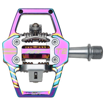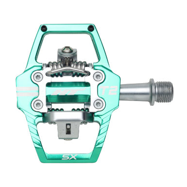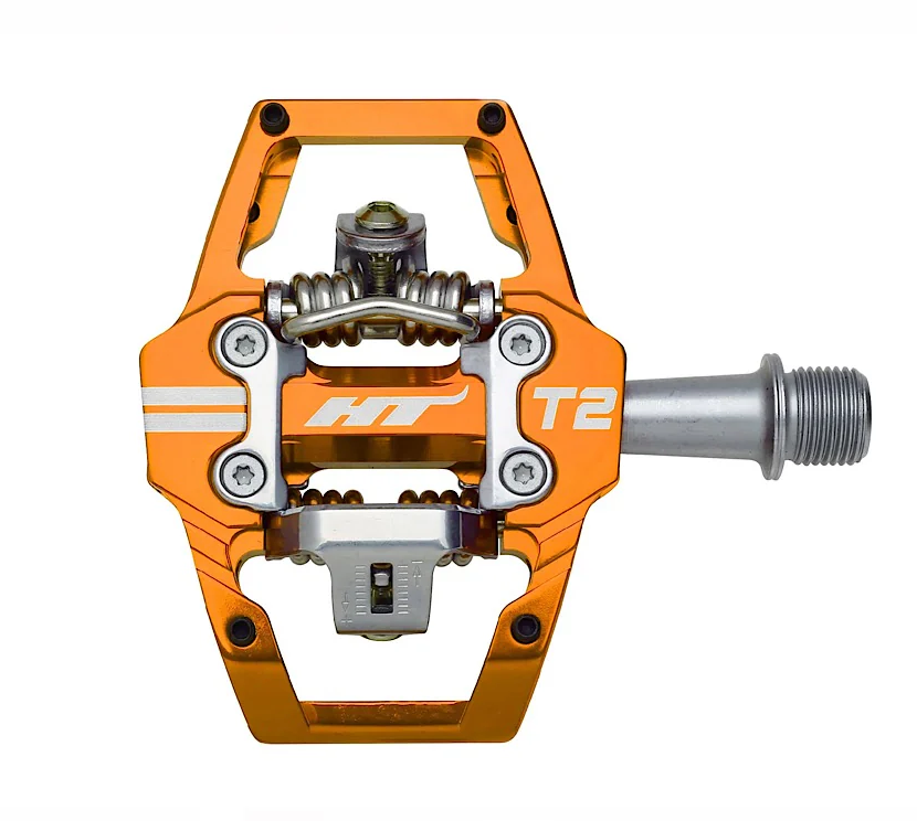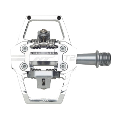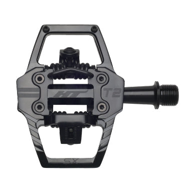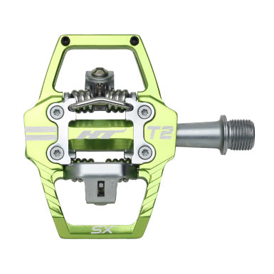 Pedali HT T2-SX, per rimanere inchiodato alla bici come non mai! Questo modello possiede un asse in acciaio al cromo-molibdeno lavorato a CNC e il corpo del pedale è anch'esso realizzato in Chromoly lavorato a CNC. Si caratterizzano per uno sgancio rapido e sicuro da regolare a proprio piacimento, giocando con la tensione della molla. I cuscinetti a sfere sigillati con boccole IGUS rendono il movimento del pedale ancora più fluido. Tacchette X1 incluse con libertà angolare da 4°.