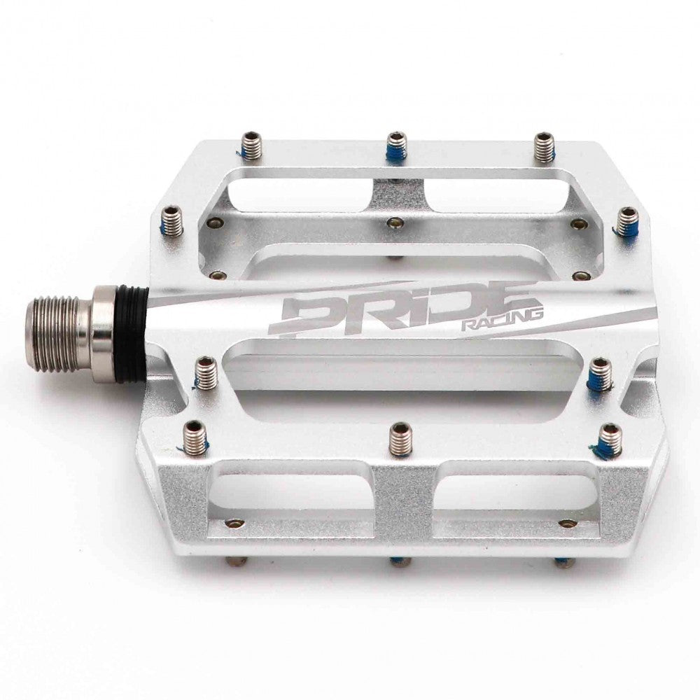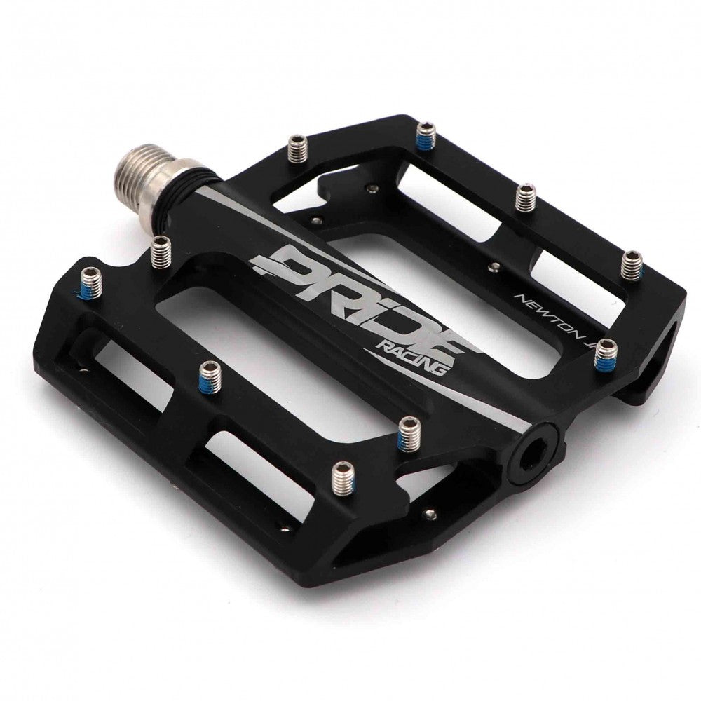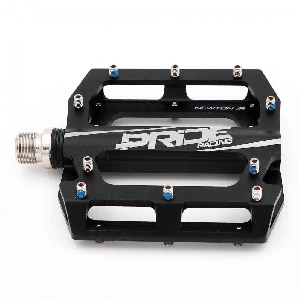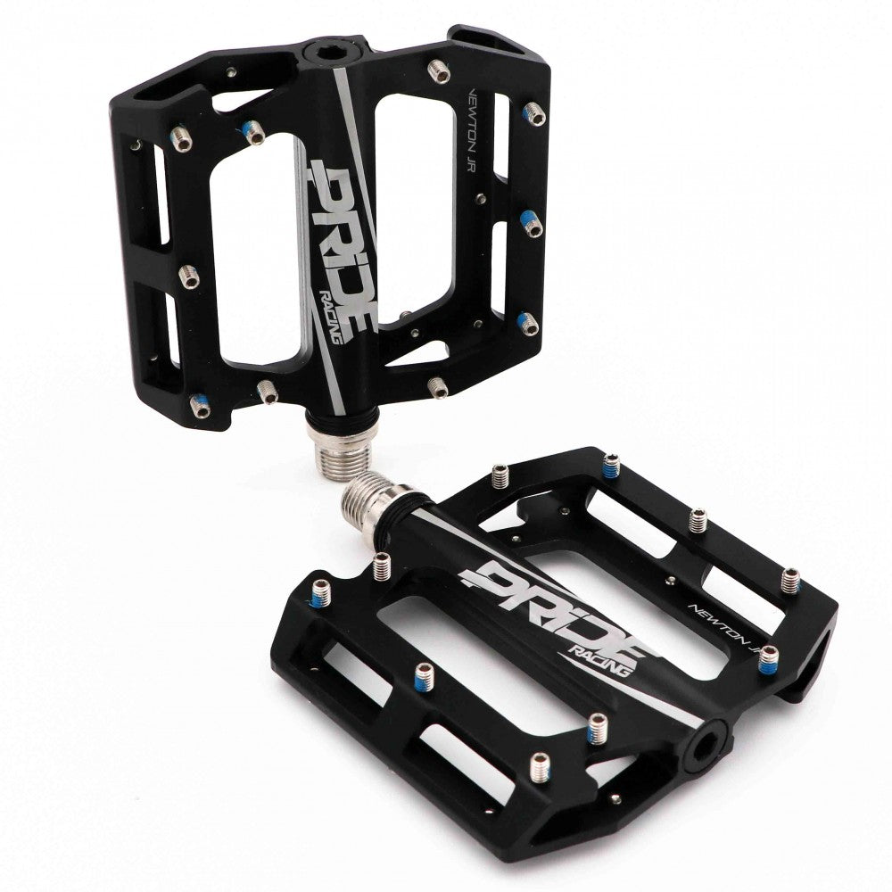 Pedali Pride Racing Newton Junior, sviluppati appositamente per i bambini! Con una piattaforma larga 94 mm, lunga 100 mm e spessa 16 mm, completamente lavorata a CNC. Estremamente robusti grazie al loro asse in acciaio al cromo trattato termicamente, si caratterizzano per una piattaforma concava che monta 10 pin per lato (M4 x 0,7), rimovibili e sostituibili, che offre il massimo grip sotto la suola.
