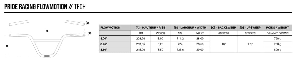 Manubrio Pride Racing Flowmotion, testato ed approvato dai piloti del team Pride Racing! Leggero e rigido, il Flowmotion ha una geometria a metà strada tra il famoso Slam Bar e le versioni più dritte presenti sul mercato. Grazie al backsweep di 10° questo manubrio ti garantisce un ottimo comfort di guida e l'upsweep di 1,5° ti consentirà un migliore posizionamento di gomiti e spalle. Realizzato in Chromoly 4130 di fascia alta senza saldatura a spessore variabile 13 Butted, con un trattamento termico 20/20 dopo la saldatura per una maggiore rigidità.