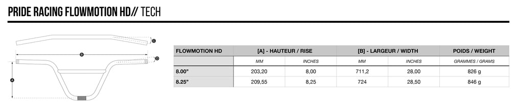 Manubrio Pride Racing Flowmotion HD, versione maggiorata da 31,8 mm, testato ed approvato dai piloti del team Pride Racing! Leggero e rigido, il Flowmotion ha una geometria a metà strada tra il famoso Slam Bar e le versioni più dritte presenti sul mercato. Grazie al backsweep di 10° questo manubrio ti garantisce un ottimo comfort di guida e l'upsweep di 1,5° ti consentirà un migliore posizionamento di gomiti e spalle. Realizzato in Chromoly 4130 di fascia alta senza saldatura a spessore variabile 13 Butted, con un trattamento termico 20/20 dopo la saldatura per una maggiore rigidità.