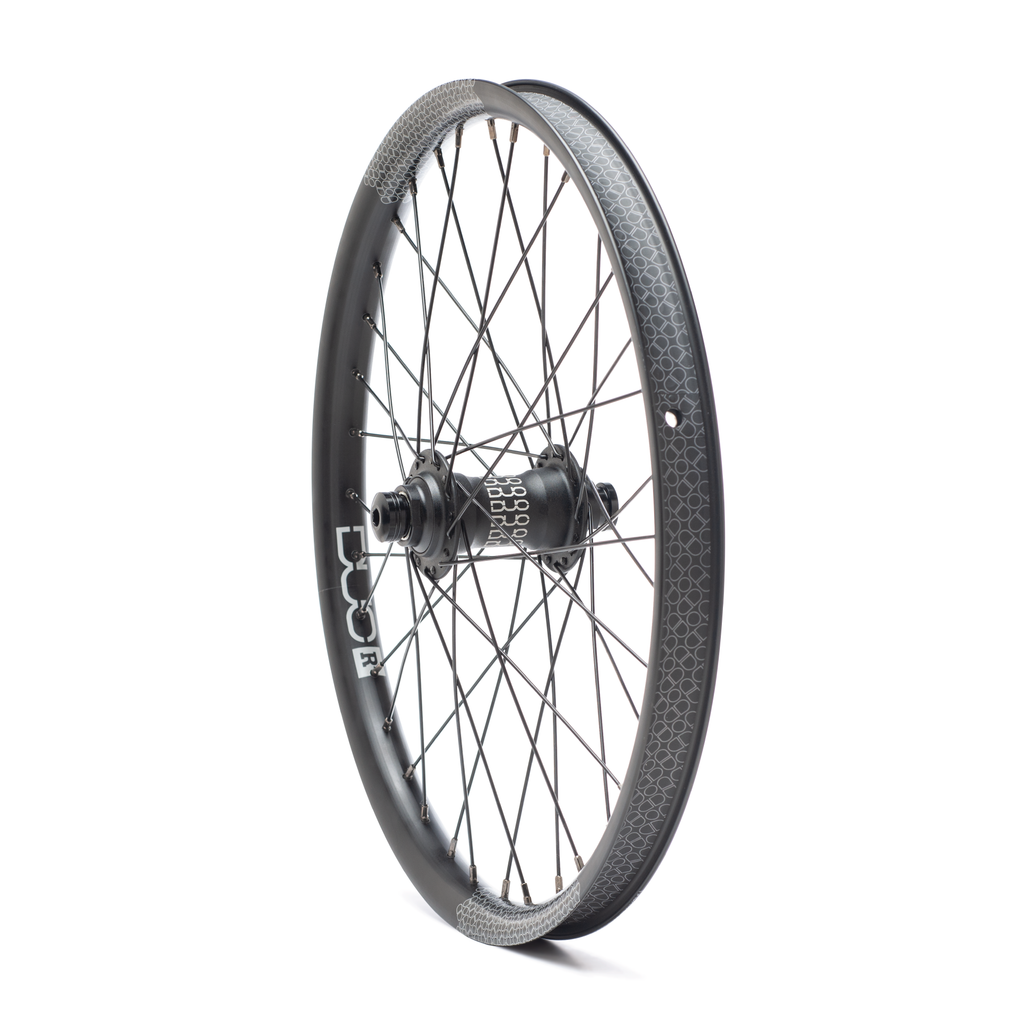 Ruota anteriore completa Duo Brand R2 con perno passante da 20 mm, leggera e veloce, perfetta per la tua BMX da Race! I cerchi Duo R2 Aero (406 x 32 mm) dall'aspetto in carbonio sono realizzati con alluminio della serie 6000, super durevole e resistente. La ruota è intrecciata con raggi in acciaio calibro 14 e nippli in ottone.