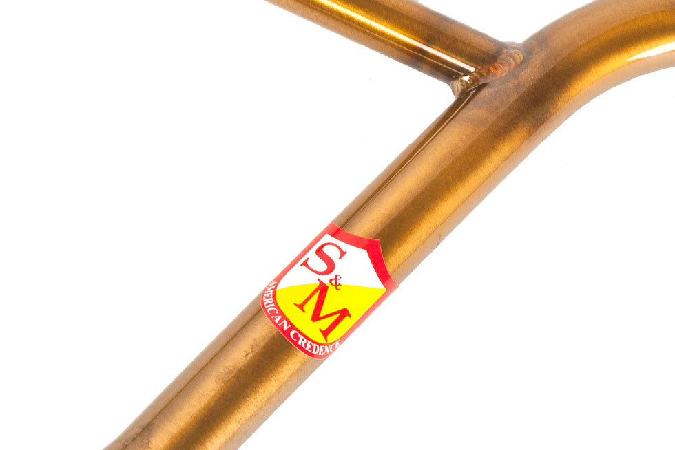 Manubrio S&M Credence XL, signature del rider Clint Reynolds, caratterizzato da curve a doppio raggio con grande curvatura superiore per aumentare la resistenza. Questo manubrio è prodotto negli Stati Uniti in Chromoly 4130 con trattamento termico post saldatura e presenta un'altezza di 9.25" con una barra trasversale (crossbar) sottile e delle curve più grandi nella parte superiore per aumentare la resistenza.