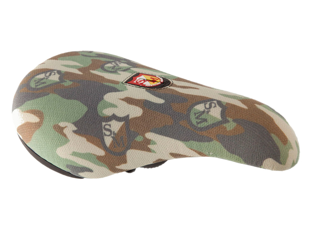 Sella S&M Camo Shield versione Pivotal, con base in stile fat. Superficie imbottita con rivestimento in kevlar molto resistente agli strappi, con bullone cavo e patch di accesso al bullone in stile S&M Shield Logo.