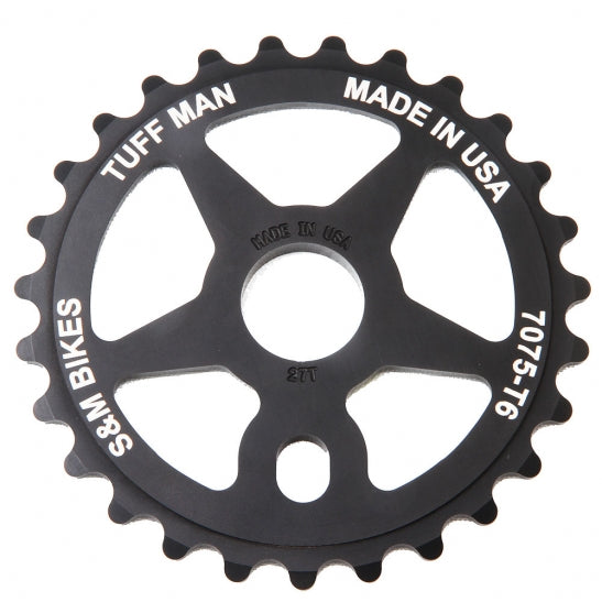 Corona S&M Tuffman, prodotta negli Stati Uniti con alluminio 7075-T6 e lavorata al CNC. Presenta un'incisione laser sul retro e un design in stile retrò. I denti sono da 1/8" (3,175 mm) e il foro centrale è da 15/16" (24 mm). Le rondelle in acciaio da 19 e 22 mm sono incluse nella confezione, rendendola compatibile con tutte le pedaliere in circolazione.