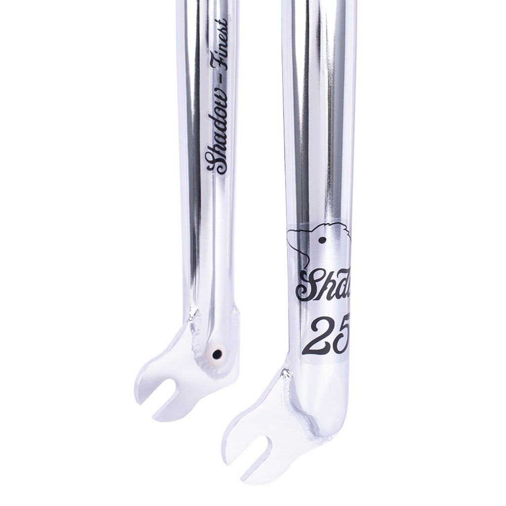 Forcella Shadow Conspiracy Finest, realizzata interamente in Chromoly 4130, leggera e resistente. Tutto ciò grazie ad un design brevettato del tubo di sterzo senza filettatura. Inoltre, presenta degli steli ottenuti tramite idroformatura, con uno spessore costante per tutta la loro lunghezza. I dropout sono realizzati tramite il sistema RigiDrop, che blocca l'oscillazione che può avere un tradizionale dropout saldato dopo un certo tempo di utilizzo. Questa forcella è compatibile con copertoni da 2.5" e viene finita con un trattamento termico al 100% dopo la saldatura.