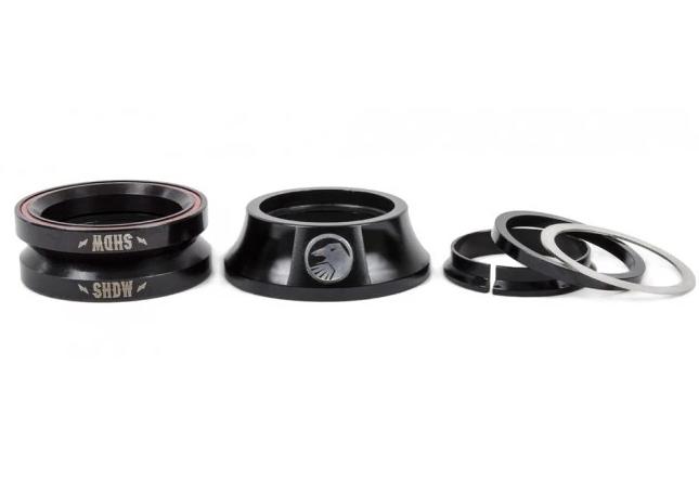 Serie sterzo Shadow Conspiracy Stacked, realizzata al 100% con lavorazione al CNC. Il cappuccio è prodotto in lega di alluminio 6061-T6 mentre i cuscinetti sigillati angolari sono personalizzati con un logo Shadow e dei sigilli rossi. La confezione include: 2 cuscinetti sigillati, tappo superiore, rondella di compressione in lega, distanziale da 2 mm.