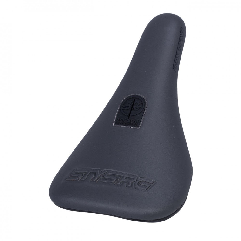 Sella Stay Strong Blackout 2 Slim Pivotal, realizzata con un rivestimento in ecopelle. Presenta un logo superiore STY SRG e loghi laterali Word, con il classico sistema di fissaggio Pivotal.