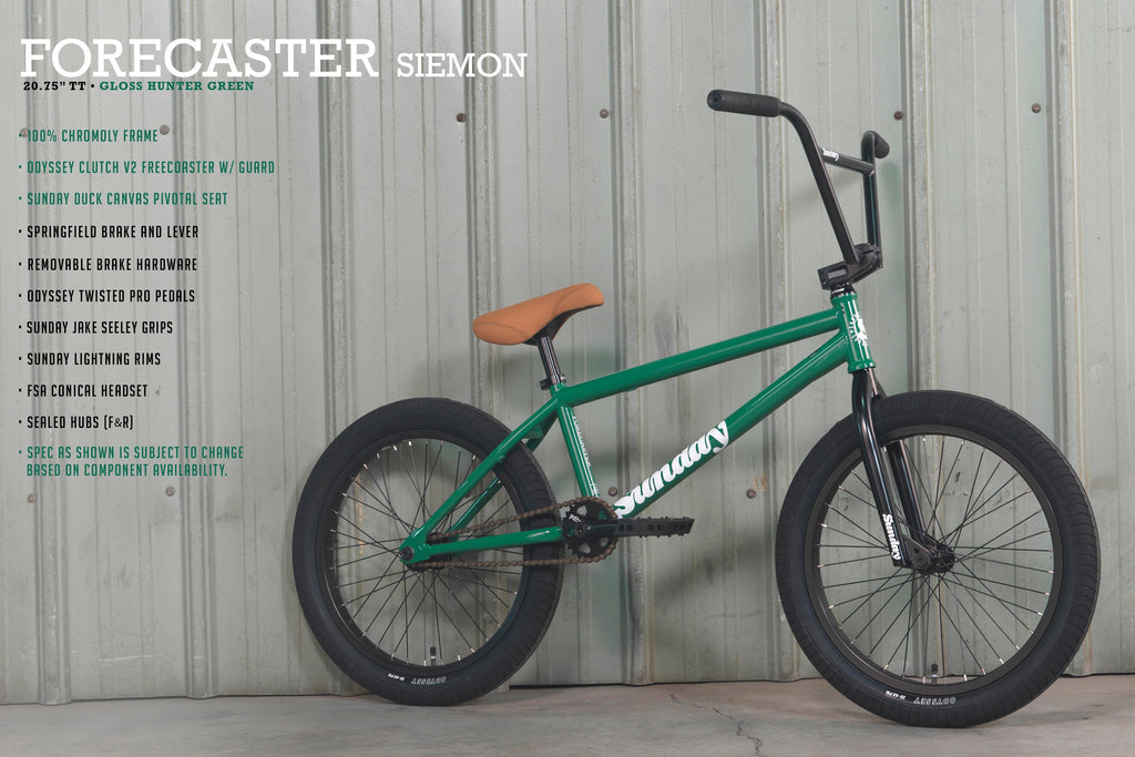 BMX completa Sunday Forecaster Siemon, versione signature del rider Alec Siemon! Questa è una BMX veramente composta, adatta per ogni stile di riding, che sembra proprio di livello professionale: quest'anno con un telaio al 100% in Chromoly! Monta tantissimi componenti aftermarket come le manopole Sunday Seeley e la sella Sunday Badge, combinati con parti incredibili come un mozzo freecoaster Odyssey Clutch V2, serie sterzo conica FSA, freni e leva freno rimovibili Odyssey Springfield, stem Sunday Freeze Top Load, pedali Odyssey Twisted Pro, copertoni Path Pro da 2.4", manubrio 4 pezzi, cerchi Sunday Lightning e mozzi anteriori e posteriori sigillati.