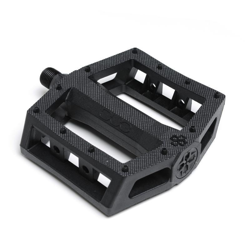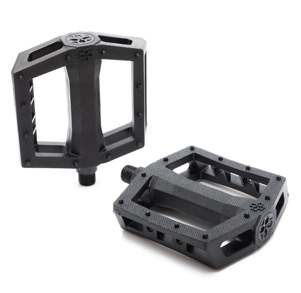 Pedali Duo Brand Resilite Platform, realizzati in un materiale composito nylon/fibra di vetro che è meno scivoloso, aderisce meglio alle suole e ha un feeling più morbido rispetto alla plastica. Caratterizzati da una superficie concava microzigrinata, 12 perni esagonali per lato, asse da 9/16" in acciaio al cromo.
