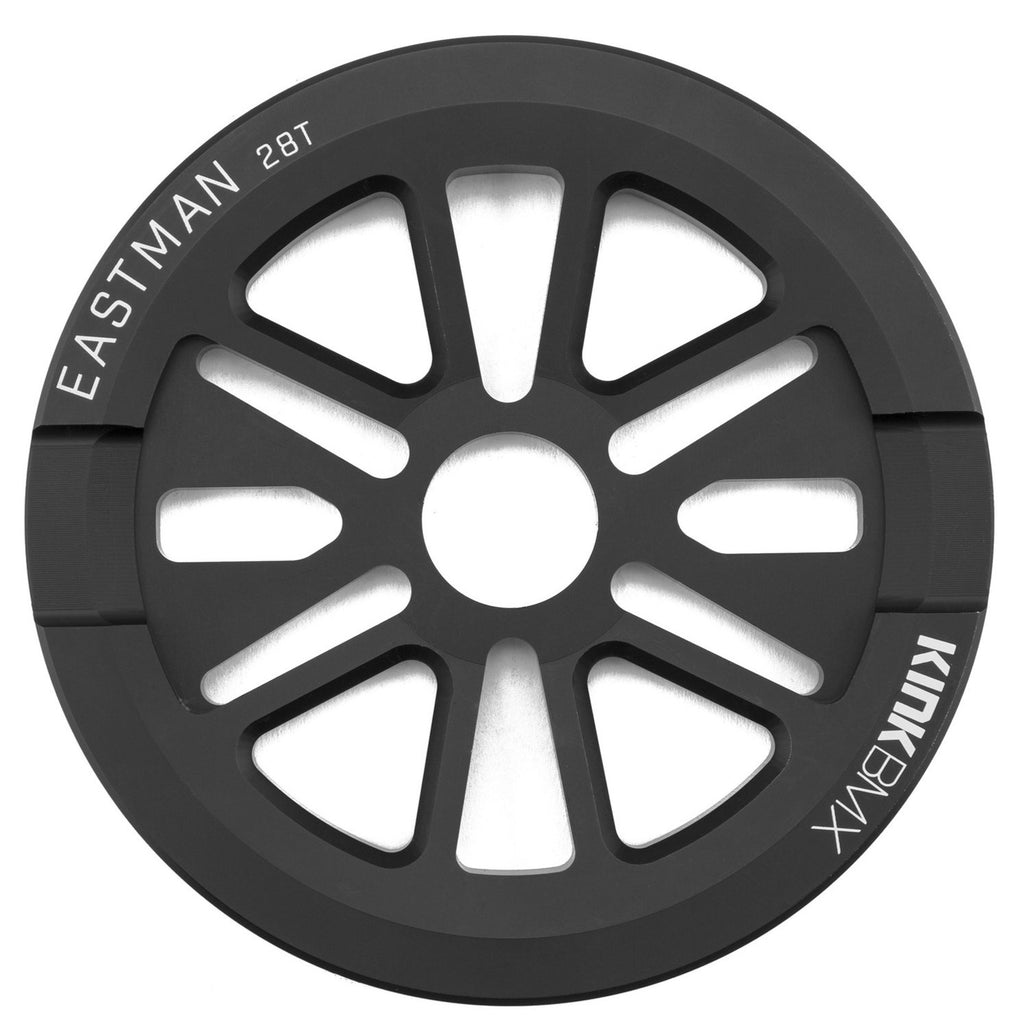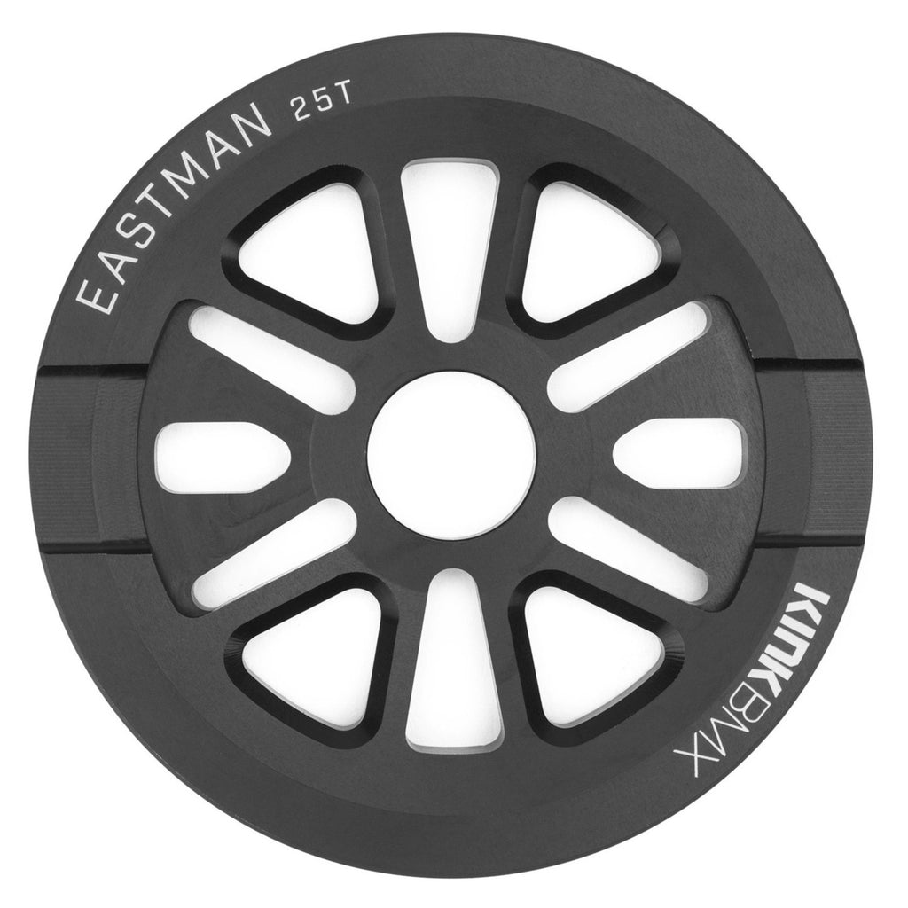 Corona Kink Eastman con guard integrato, realizzato in Alluminio 6061-T6 lavorato al CNC. I rilievi delle pedivelle lavorati creano lo spazio adeguato per tutte le pedaliere più diffuse e l'offset del guard consente a tutte le catene di varie larghezze di adattarsi, garantendo la massima compatibilità di questa corona. Il suo design tecnico crea un'estetica pulita e simmetrica e fornisce un'enorme resistenza dove è necessario. Due posizioni di rotazione prolungano ulteriormente la vita della corna Kink Eastman. Adattatori per assi da 19, 22 e 24 mm inclusi.